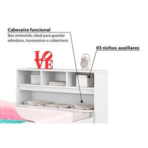 Dimensões(Cm): Comprimento(Profundidade): 219cm x Largura: 101cm x Altura: 102,5cm Material de Estrutura - MDF/MDP Tipo de Pintura - Ultravioleta Tipo de Acabamento da Pintura - Alto Brilho Diferenciais dos Móveis de Quarto - Móvel c/ Baú Tamanho da Cama - Solteiro Tamanho do Colchão Indicado - Solteiro 88x188 Diferenciais das Camas - c/ Gavetas Tipo de Dobradiças - Dobradiças Metálicas Tipo de Corrediça - c/ Corrediças Metálicas Quantidade de Gavetas - 2 Gavetas Quantidade de Prateleiras - 1 Prateleira Quantidade de Nichos - 3 Nichos Montagem do Produto - Desmontável Certificação de Qualidade - Qualidade Aprovada Garantia - Garantia de 90 Dias