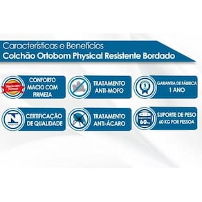 Camadas Interna do Estofamento de Espuma do Colchão - Alta Qualidade - HR de Alta Resiliência Tipo de Espuma do Colchão - Espuma de Poliol Vegetal Densidade da Espuma do Colchão - 20 Nível de Firmeza do Colchão - Macio c/ Firmeza Peso Máximo Suportado do Colchão - 60 kg