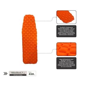 Colchonete Laranja Inflável 188x58x5cm Eficiência Térmica Colchonete Laranja Inflável 188x58x5cm Eficiência Térmica ===================================== Projetado para proporcionar um descanso de qualidade para camping, trilhas, caminhadas ou acampamentos, este modelo combina eficiência térmica e estrutura ergonômica com um design ultracompacto.