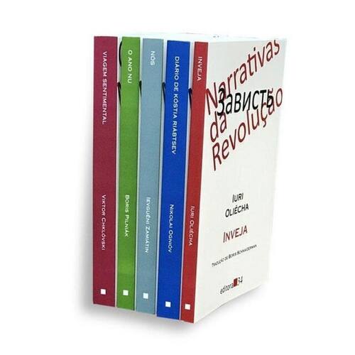 A série Narrativas da Revolução , dirigida por Bruno Barretto Gomide , da USP, traz cinco obras de ficção que dialogam diretamente com a Revolução Russa de 1917 e dão prova da diversidade de caminhos estéticos e da extraordinária força inventiva do período: Nós , de Ievguêni Zamiátin (1921), O ano nu , de Boris Pilniák (1922), Viagem sentimental , Viktor Chklóvski (1923), Diário de Kóstia Riábtsev , de Nikolai Ognióv (1925), e Inveja , de Iuri Oliécha (1927). Conjunto de livros envoltos em plástico transparente, não é BOX.