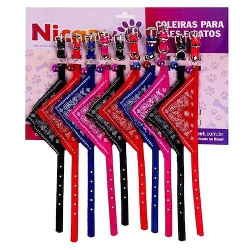 Coleira Bandana Para Cães E Gatos - Cartela Com 10 Unidades. Coleira de material sintético com bandana e guizo - Ideal para cães e gatos. - Acompanha bandana e o guizo. - Fivela de metal com regulagem facilitando o uso. - Disponíveis nas cores: Preto, Rosa, Azul e Vermelho - Cartela com 10 unidades de cores Medidas aproximadas: Largura: 1 cm Comprimento: 21 cm a 31 cm Deixei seu Pet com conforto e elegância Marca: Não Informado Ean: 7436895806510