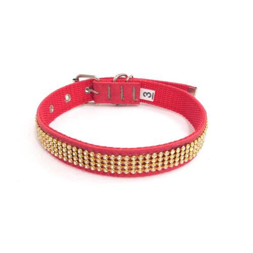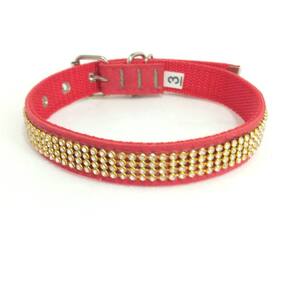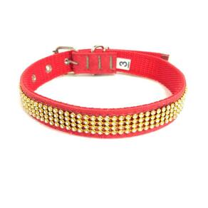 Tecido nylon com camurça todo cravejado de Strass; Costura reforçada; Fivela de Metal com regulagem de tamanho; Disponíveis na cor: Vermelha Quantidades: kit com 4 unidades todas do tamanho nº 03. Medidas aproximadas: 30 cm a 40 cm de circunferência do pescoço, 2 cm de largura. Esta coleira é uma ótima escolha para as pessoas que buscam conforte estilo para passear com seu pet. Marca: Nica pet Ean: 7435682571372