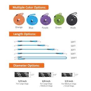 - Vários tamanhos e diâmetros. Coleira longa para cães: 3 m, 16 pés, 30 pés, 50 pés e 30 m, vários tamanhos podem atender a diferentes propósitos de treinamento. Nossa coleira para cães está disponível em diâmetro de 1/7.6 cm, 3/20.3 cm, 1/5.1 cm. O diâmetro de 1,3 cm pode atender a cães pequenos, gatos ou outros animais pequenos. O diâmetro de 3/20.3 cm e 1/5.1 cm é a melhor escolha para treinar coleiras para cães grandes ou médios.