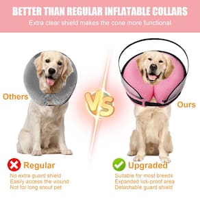Ao escolher um tamanho, considere não apenas a circunferência do pescoço do seu cão, mas também a largura do cone e a altura do escudo para garantir a cobertura completa da ferida. As alternativas de cone para cães pequenos devem se estender para fora da boca do seu cão para evitar que ele morda o escudo ou alcance a ferida. Este cone inflável para cães pode não ser adequado para cães com narizes mais longos, pernas ou caudas ou raças mais ágeis. - Escolha o tamanho certo: ao escolher um tamanho, considere não apenas a circunferência do pescoço do seu cão, mas também a largura do cone e a altura do escudo para garantir a cobertura completa da ferida. As alternativas de cone para cães pequenos devem se estender para fora da boca do seu cão para evitar que ele morda o escudo ou alcance a ferida. Este cone inflável para cães pode não ser adequado para cães com narizes mais longos, pernas ou caudas ou raças mais ágeis. - Design 2 em 1 com proteção dupla: este cone grande para cães combina uma coleira inflável com uma barreira macia transparente para fornecer proteção total sem interferir nas atividades diárias do seu animal de estimação. O escudo removível ajuda a evitar que seu cão alcance certas áreas. Para um uso ideal, supervisione seu cão enquanto usa a coleira de recuperação do cão. O monitoramento constante é essencial para evitar que seu cão morda ou danifique a guarda! - MATERIAL DE QUALIDADE PREMIUM: A coleira de donut para cães pós-cirurgia é feita de tecido 3D, fofo, macio e tão confortável quanto usar um travesseiro de donut de pescoço de penas. Ajuda a reduzir a ansiedade do seu animal de estimação e cria uma experiência confortável e livre de desconforto para o seu animal de estimação. Também é fácil de limpar, se necessário, basta abrir o zíper para remover o tecido externo e jogá-lo na máquina de lavar. - Garanta a inflação adequada: apare as unhas do seu cão para evitar arranhões, o que pode perfurar a coleira de cone inflável do seu cão. A válvula de enchimento tem um pequeno recorte - aperte a parte inferior da válvula para abri-la e deixe o ar entrar. Para beliscar, coleira inflável para cães usando uma bomba ou boca comprada selecionada. Você pode ajustar a firmeza variando a inflação para evitar colocar muita pressão nas costuras, o que pode causar vazamentos. Uma vez inflado, cubra rapidamente a válvula com a tampa para selá-la. - Ajuste ajustável e perfeito – Se você está preocupado com o cone da cabeça do seu cão escorregar ou cair, projetamos uma posição de fixação no interior da coleira de recuperação de cães que pode ser presa simplesmente passando a coleira do seu animal de estimação no dia a dia. Além disso, a abertura da gola está equipada com uma tira de fecho aderente que permite ajustar a elasticidade para garantir um ajuste perfeito no pescoço. Lembre-se de colocar a alça lateral na parte de trás do pescoço do seu cão para evitar mordidas.
