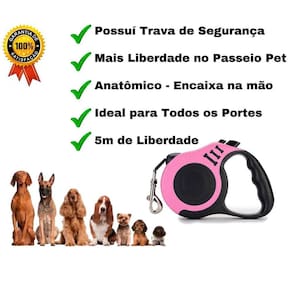 Características: 5 metros de guia para mais liberdade Segurança e controle durante o passeio Suporta até 20kg Produzido com material de qualidade Trava de segurança