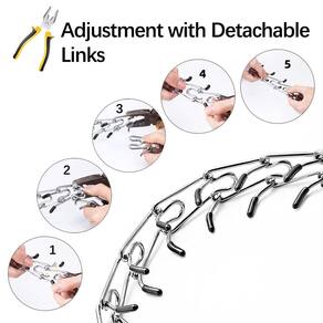 O perímetro da coleira de treinamento para cães pode ser ajustado, adequado para cães pequenos, médios e grandes cães. Você pode adicionar ou remover correntes individuais na coleira de aperto para se ajustar ao pescoço do seu cão conforme necessário. Ajuste com ferramentas como alicates. - ?Treinamento correto?--- Coleira de aperto para cães, fornece pressão necessária de treinamento enquanto protege as áreas sensíveis das vias aéreas e do pescoço dos cães. Não há necessidade de gritar com um cão ou castigar. Você só precisa puxar a coleira de treinamento e o cão vai parar de ser atrevido imediatamente. - ?Segura e eficaz? --- A coleira de treinamento para cães coloca pressão uniforme nos lados do pescoço e não na traqueia, as extremidades das garras da coleira de asfixia são protegidas por pontas de borracha que podem evitar danos ao pescoço do seu cão. - ?TAMANHO AJUSTÁVEL?--- O perímetro da coleira de treinamento para cães pode ser ajustado, adequado para cães pequenos, médios e grandes cães. Você pode adicionar ou remover correntes individuais na coleira de aperto para se ajustar ao pescoço do seu cão conforme necessário. Ajuste com ferramentas como alicates. - ?Material de alta resistência?--- Nossa coleira de pinos é feita de aço inoxidável cromado de alta resistência recomendado por treinadores. As coleiras de garras para cães têm um revestimento prateado para elos que podem proporcionar um período de uso estável para seus cães. - Um cão chamado Abby perdeu o olho direito por causa de um acidente. O cão tornou-se sensível e frágil. O dono de Abby descobriu que Abby ficaria muito feliz toda vez que ele o pegava para jogar, então vendeu sua casa e comprou um iate, e começou uma viagem com Abby em 25 estados. Embora Abby tivesse apenas um olho para a segunda metade de sua vida, o amor que o dono deu a Abby deu a Abby o mundo.
