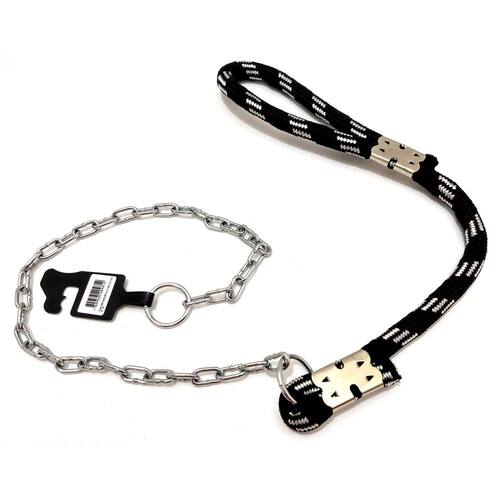 Guia de corda roliça de nylon 60 cm de comprimento por 18 mm de espessura; de corrente de elo reto 3,5 mm por 70 cm; Guias unificadas resistentes para cães de médio á grande porte. Excelente para educar seu cachorro e ensinalo a andar ao seu lado, não arrastalo e não puxalo. Com alça protetora para as mãos, possui em sua ponta abraçadeira de corrente de metal resistente. Marca: Não Informado