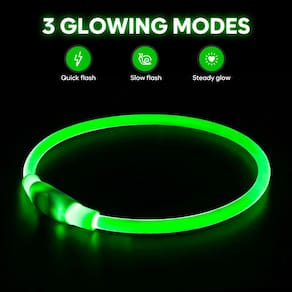 - ?Ecológico e resistente à água?Basta puxar uma extremidade do tubo de TPU e colocá-lo ao redor do pescoço do seu cão, depois deslizar a extremidade de volta para dentro da coleira para prendê-lo e alterar os modos de flash pressionando o botão de energia de silicone. O design resistente à água permite caminhar na chuva ou em outras condições úmidas.
