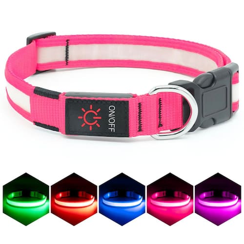Coleira de LED VIZPET com luz super brilhante para manter seu cão seguro na noite escura.