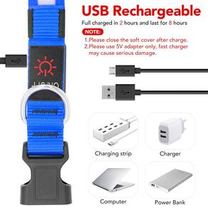 - ?Leve e recarregável por USB? – Nossa luz de coleira para cães com um acolchoado macio faz com que seu cão se sinta confortável. Pare de perder tempo com trocas frequentes de bateria ou carregamento. Pode ser carregado a partir de qualquer dispositivo (exceto o carregador rápido) através de qualquer cabo micro USB. Pode ser carregado em computadores, carregadores de carro, carregadores de energia, etc. Observação: use apenas o adaptador USB de 5 V.