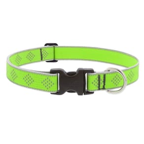 . As luzes altas estão disponíveis em 6 cores brilhantes e três larguras: 1/2", 3/4" e 1". Essas coleiras de 2,5 cm de largura estão disponíveis em três faixas de tamanho ajustáveis: 12-20 polegadas; 16-28 polegadas; 25-31 polegadas. Para determinar o tamanho correto da coleira, meça bem no meio do pescoço do cão e adicione 5% a mais para um ajuste confortável. Ou meça o colar atual