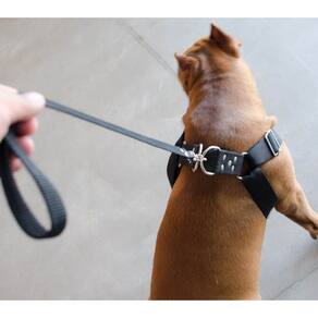 Coleira peitoral com guia e adaptador para cinto de segurança veicular, feita especialmente para cães de grande e médio porte.