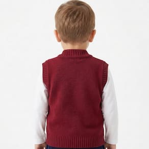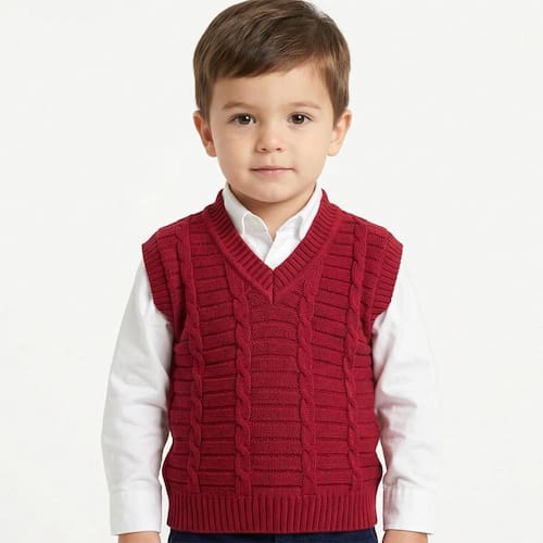Colete de Trançado Tricô Kids Canelado feito em tecido algodão e acrílico, gola em V, estampa trançada e etiquetas personalizadas.