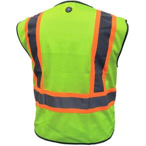 Colete de segurança GE High Visibility, acabamento refletivo com acabamento contrastante, tecido de malha respirável, 1 bolso externo no peito, 1 bolso interno na cintura, fecho com zíper.