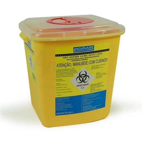 Coletor rígido para perfurocortante VACUPLASTFinalidade:O Coletor Perfuro Cortante, é utilizado para descarte de produtos afiados (agulhas, lancetas, vidros em geral, lâminas de bisturi, ampolas, catéteres, etc.), que possam levar o indivíduo a acidentes com lesões, perfurações, cortes e contaminações biológicas.Capacidades: 7 litrosCaracterísticas:Confeccionado em plástico rígido;Cor amarelo;Atendendo a NR-32 do MT.