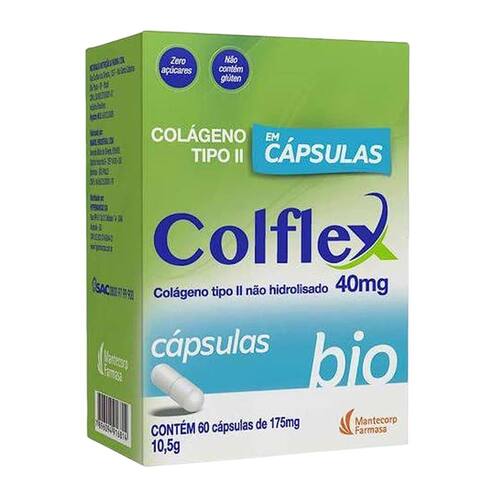 Colflex Bio é um suplemento alimentar em cápsulas que contém colágeno tipo II não hidrolisado, ingrediente amplamente utilizado como parte de uma rotina nutricional equilibrada. Cada cápsula fornece 40mg da substância, sendo uma opção prática para quem busca incluir esse composto em sua alimentação diária.