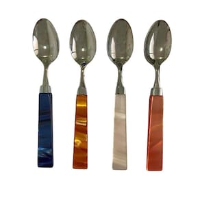 São fabricados em aço inoxidável 18/10 e apresenta um elegante cabo de madrepérola em acrílico colorido.
