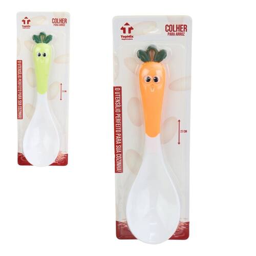 Colher de Arroz Plástico 23cm Legumes Sortid Colher em Plástico para arroz, produto resistente de alta qualidade. Além de lindas, são ótimas auxiliares no preparo das receitas, pois são atóxicas e resistem à mudança de temperatura, sem deformar e aquecer, e ainda, sem danificar o fundo das panelas ou recipientes. Por serem peças inteiriças, não absorvem líquidos e resíduos, sendo assim higiênicas e fáceis de lavar. Disponível nas cores: Cenoura (Laranja), Verde (Rabanete). A Nipo Center possui a maior variedade de produtos a pelo menor preço.\nEspecificações:\nMarca : TOP MIX\nTipo de material : Plástico\nCores ou Estampa : diversos\nDimensões do Produto : 23 X 6,5 X 5,5 CM\nDimensões da Embalagem : 29 X 9,5 X 5,5 CM\nPeso Bruto (Gramas) : 0.048 Marca: Não Informado
