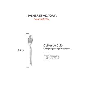 Colher de Cafe em aço inox. A linha de talheres Victoria da Gourmet Mix possui design em linhas ovaladas, detalhes com leve risco nas bordas dos cabos e acabamento em alto brilho. Peça totalmente em aço inoxidavel.