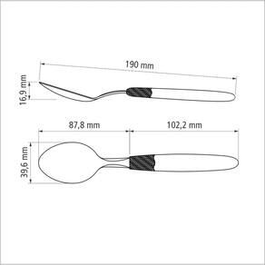 Suas refeições ficarão ainda melhores com a Colher de Mesa Tramontina Ipanema com Lâmina em Aço Inox e Cabo de Polipropileno Azul. Produzida com lâmina em aço inox com espessura que garante alta resistência e durabilidade e com cabo de polipropileno que proporciona um manuseio muito confortável e suave, ela ainda vai levar mais alegria às suas refeições, devido a cor azul. Muito fácil de limpar, ela ainda pode ir à máquina de lavar louças diariamente, otimizando suas tarefas na cozinha. O talher ideal para completar suas refeições! Orientações A lâmina de aço inox garante maior resistência devido a espessura do aço e a estampagem da lâmina. O cabo de polipropileno possui maior resistência e durabilidade. Pode ir à máquina de lavar louças facilitando seu dia a dia. Observações Antes da primeira utilização, lave bem a peça e seque-a.Produto cortante e perfurante: tenha cuidado ao manusear e mantenha fora do alcance das crianças.Para maior durabilidade do produto recomenda-se secar bem antes de guardar, mesmo após lavagem em máquina. Para descarte do produto e embalagem siga as orientações de reciclagem vigentes. Características Gerais EAN13 7891112042537 DUN14 17891112042534 NCM 8215.99.10 Peso Líquido 0,0280 kg. Peso Bruto 0,0280 kg. Metragem 0,000129 m³. Dimensões Embalagem (Compr. X Larg. X Alt.) 190x 40x 17 mm. Cor 1 041E42 Hexa