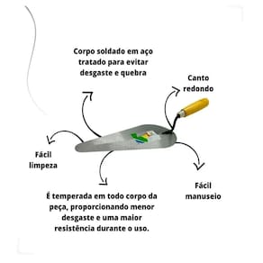 - Canto Redondo e Espessura Reforçada: Maior durabilidade e eficiência no manuseio da argamassa. - Corpo Forjado em Aço Tratado: Evita desgaste e quebra, mesmo em uso intenso. - Peça Totalmente Temperada: Proporciona resistência extra e longa vida útil. - Cabo de Madeira de Origem Renovável: Oferece firmeza, conforto e responsabilidade ambiental.