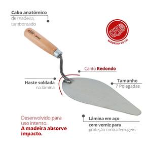 A Colher Soldada Durín é a ferramenta essencial para o preparo e aplicação de materiais na construção civil. Utilizada para mistura de massas e aplicação de argamassa no assentamento de blocos, ela garante eficiência e durabilidade. Possui uma lâmina de aço com verniz protetor contra ferrugem e uma haste soldada, reforçada por um cabo de madeira de lei anatômico.