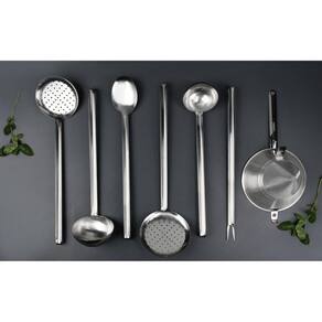 Totalmente feita de aço inox, por isso não solta nenhum resíduo nos alimentos, mantendo-os saudáveis. Altamente durável mantém suas características , preservando a beleza, a higiene e a durabilidade do material. Acabamento em brilho. Cabo longo e inteiriço, ideal para uso em cozinhas industriais. Higiênica e de fácil limpeza. Pode ser lavada diariamente na máquina de lavar louças.