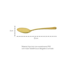 Colher dourada ideal para arroz. Utensilios de cozinha da linha Lovers possui design em linhas ovaladas, acabamento acetinado que garante um design moderno, e combina com qualquer estilo. Produzido totalmente em aço inox de alta qualidade, com banho especial em PVD ((Physical Vapor Deposition), processo que produz vapor metalico de camada colorida e proporciona maior resistencia ao desgaste e corrosao, prolongando o periodo de vida util das peças. Esses talheres com certeza vao te surpreender. E podem ser lavados em maquinas de lava-louças e comparados a outros tipos de materiais, sao bem mais resistentes e duraveis.