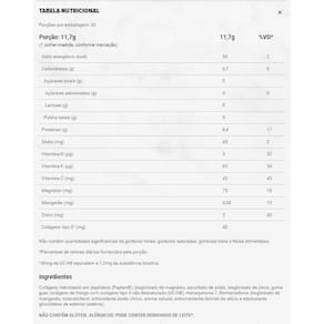 Ingredientes: colágeno hidrolisado em peptídeos peptan , bisglicinato de magnésio, ascorbato de sódio, bisglicinato de zinco, goma guar, colágeno de frango com colágeno tipo ii não desnaturado uc-ii , menaquinona-7, fitomenadiona, bisglicinato de manganês, colecalciferol, antioxidante ácido cítrico, aroma natural, antiumectante dióxido de silício e edulcorante glicosídeos de esteviol estévia . Não contém glúten.