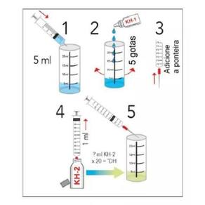Colombo Marine KH Test - Alcalinidade O KH Test da Colombo te ajuda a definir a alcalinidade em aquários marinhos água salgada . Realiza 40 testes.Conteúdo da caixa:2 Reagentes 1 frasco é conta gotas ;1 Seringa graduada 6 ml;1 Seringa graduada 1 ml + 1 ponteira para utilizar no frasco 2 ;1 Frasco para realização do teste;1 Manual de instruções. Recomendações gerais: Certifique-se de que o tubo de teste está limpo antes de utilizá-lo Limpe o tubo imediatamente após o uso Colha a amostra de água de maneira mais precisa possível Quando for pingar as gotas do reagente, mantenha o tubo com reagente inteiramente na posição vertical Certifique-se de que nas gotas do reagente não há bolhas de ar Instruções de Uso1. Pegue uma amostra de 5 ml de água salgada2. Adicione 5 gotas do reagente KH-1 e misture. A amostra deve ficar com uma coloração azul clara vide verso da embalagem . Se a amostra ficar amarela significa que o kH está abaixo de 1 dkH.3. Encaixe a ponteira plástica na seringa de 1 ml e preencha a seringa com o reagente KH-2 com 1 ml. É normal haver uma bolha de ar entre o líquido e a base do pistão. Este ar é referente ao ar presente dentro da ponteira e não afetará o resultado.4. Adicione o reagente KH-2 a amostra misturando de gota a gota até que a solução fique amarelo esverdeado vide verso da embalagem . Dica: observe esta mudança de cor olhando de lado.5. Verifique a quantidade de reagente KH-2 que foi utilizado para que a coloração da solução fosse do azul claro para o amarelo esverdeado. Multiplique este volume de reagente por 20 e terá o resultado em dkH vide tabela deste manual . Ex: Foi utilizado 0,35 ml do reagente KH-2 - 0,35 x 20 = 7 dkH.