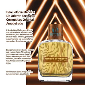 Deo Colônia Madeira Do Oriente Facinatus Cosméticos Oriental AmadeiradoA Deo Colônia Madeira do Oriente com saída oriental e forte fixação amadeirada, traz a masculinidade em suas notas olfativas, pensando exclusivamente em homens fortes que gostam de deixar sua marca.Esse perfume é um clássico e agora está redesenhado. A fragrância continua com a mesma classe e força e a embalagem está mais moderna, versátil e interessante. Resultando em uma fragrância única.Perfume com ótima fixação, irá se surpreender com a qualidadeProduto notificado na ANVISA. Empacotamento: O produto e lacrado direto da indústria, e reforçado com fita adesiva, para suportar o transporte sem vazamento, empacotada e reforçada com caixa de papelão, para que seu pacote chegue intacto pronto para uso ou revendaSeu pedido contem:1 Deo Colônia Masculina 100 ml Marca: Facinatus Cosméticos