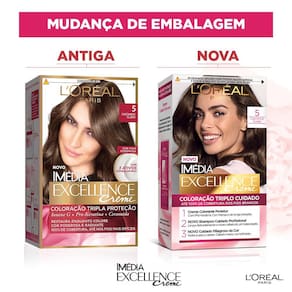 LOJA OFICIAL Loreal Paris__________________________________________________PRODUTO:Coloração Imedia ExcellenceCremeL'Oreal Paris -5 CastanhoClaro__________________________________________________Descrição:Imedia Excellence CremedeL'Oreal Parisea Coloração que proporciona 100% de cobertura dos brancos e cabelos 85% mais resistentes.AColoraçãoImedia Excellence Cremeproporciona cobertura completa dos fios. Sua tecnologia avancada protege e cuida dos cabelos antes, durante e depois da Coloração, com ate 6 semanas de tratamento condicionador intenso.BENEFICIOS: 100% cobertura dos fios brancosCores ricas e vivasLonga duracaoMODO DE USAR:Proteja e prepare seus cabelos para a Coloração com o Serum Protetor.Coloque as luvas e uma toalha sobre os ombros para proteger suas roupas de respingos ocasionais. Coloquetodo o conteudo do tubo colorante dentro do frasco aplicador, feche o frasco e agite bem. Para agitar a mistura, utilize unicamente o frasco aplicador auto-quebravel. Quebre a tampa imediatamente apo agitar. Se desejar, pode utilizar tambem o pente aplicador.Nao enxague o Serum Protetor e aplique diretamente a Coloração. Siga as instrucoes de aplicacao e o tempo de pausa, contidas no folheto informativo no interior do kit. Jogue um pouco de agua morna, massageio os cabelos suavemente e, em seguida, enxague totalmente com agua abundante. Por ultimo aplique o tratamento condicionador, deixe-o agir por 2 minutos e enxague novamente.__________________________________________________HISTORIA DA MARCA:Presente em mais de 120 paies, aLoreal Paristem como filosofia a inovacao constante para oferecer ao maior numero de consumidores possivel os produtos mais eficientes, ao melhor preco. O resultado deste trabalho e uma marca de beleza completa, com uma variedade de produtos eficazes e inspiradores para as necessidades especificas de cada mulher: tratamento e Coloração capilar, tratamento da pele e do corpo, protecao solar e maquiagem. A marca tem a ciencia e a tecnologia como aliadas; a beleza, excelencia e elegancia como suas paixoes.__________________________________________________