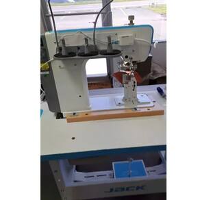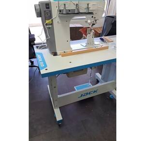 Máquina de costura de coluna de 1 agulha eletrônica com sistema de corte curto, motor de passo no transporte principal e no rodízio e levantador de calcador, ponto fixo, transporte triplo por rodízio, lançadeira normal, velocidade de 2.500RPM, altura do calcador de 15MM, tamanho do ponto até 7MM, com painel touchscreen, com mesa e estante com rodinhas.Funções