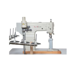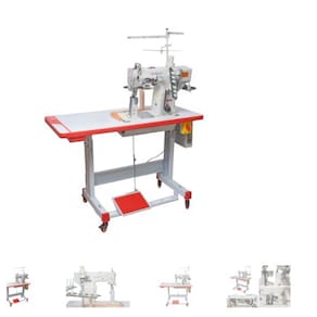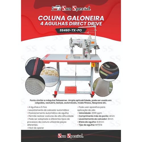 Máquina de costura industrial galoneira plana eletrônica com motor direct drive. Possui 4 agulhas e 6 fios, capaz de realizar pontos similares a máquinas flatseamer. Levantamento automático do calcador e posicionamento automático da agulha. Velocidade de até 2000 pontos por minuto (ppm). Indicada para vestuário, calçados, bolsas, moda fitness e neoprene. Comprimento máximo do ponto de 4mm e bitola de agulha de 6.0mm. Permite o uso de aparelhos para aplicação de viés.Funções