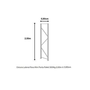 Coluna Lateral Para Mini Porta Pallet 500Kg 2,00m X 80cm AmapáA Coluna Lateral do Mini Porta Pallet de 500kg, dá sustentação do mini porta pallet e recebe o encaixe das longarinas em suas furações. A coluna lateral é composta por colunas, travessas diagonais e horizontais, sapatas, kit de parafusos e embalagem. todos os itens são reforçados para resistência e durabilidade. pintura do produto é feita por meio da técnica eletrostática, com tratamento anticorrosão uniforme e resistente deixando um acabamento de alto padrão.EspecificaçõesCor: CinzaMaterial: AçoMarca: AmapáPeso Total Suportado: 1500kgModelo: Coluna Lateral Mini Porta Pallet 500kgDimensões Altura: 2,00mProfundidade: 0,80m Contém 01 Coluna Lateral Para Mini Porta Pallet 500Kg 2,00m X 0,80cm - Amapá Entrega Via: TransportadoraPrazo: Consulte pelo CEP com nossos vendedores Garantia Contra Defeitos de Fabricação: 3 meses DevoluçãoEm até 7 dias após a chegada do produto, você tem o direito de realizar a devolução. Mas para isso, a mercadoria não deve ter sido montada, utilizada e danificada.Horário de AtendimentoSegunda a Sexta-feira, das 13:00h às 17:00h. Dúvida, Informações, Consulte Nossos Vendedores Via WhatsApp\nFicha Técnica\nCódigo MK4\nModelo Linha Mini Porta Pallet 500kg\nCategoria Acessórios\nMarca Amapá Metalúrgica\nItens Inclusos 1 Coluna Lateral Mini Porta Pallet 500Kg 2,00m x 80cm Amapá\nGarantia 1 ano após o recebimento do produto\nDisponibilidade Disponível em 2 dias úteis\nInformação adicional Dúvidas, Consulte Nossos Vendedores Via WhatsApp. Marca: Não Informado