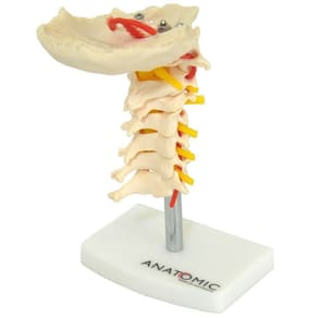 Modelo anatômico da coluna vertebral cervical, em tamanho natural, com lâmina do osso occipital, vértebras cervicais com discos intervertebrais, nervos e artérias cervicais. Confeccionado em resina plástica. Montado em haste de metal e fixo em base.Composto por:Lâmina osso occipitalArtérias vertebraisNervos cervicais7 Vértebras cervicais