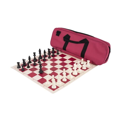A combinação de conjunto de xadrez de luxo inclui um (cada) dos seguintes itens... Peças de xadrez de plástico com regulação tripla Padrão Staunton tradicional. King de 9,5 cm com 3,8 cm de diâmetro da base. Conjunto completo de 34 peças – Inclui duas rainhas adicionais para de peões! Fabricado em plástico e é praticamente indestrutível. Triplo peso para melhorar a estabilidade e o desempenho. Tabuleiro de xadrez de vinil (quadrados de 5,7 cm) Possui etiquetas de classificação e arquivo em todos os lados - ideal para iniciantes! Fabricado em vinil de alta qualidade e resistirá à sujeira, rasgos e derramamentos. Enrola em forma de tubo apertado para facilitar o transporte Bolsa de xadrez de luxo. Tamanho de 61 x 23 cm. Projetado para armazenar todos os equipamentos de xadrez, incluindo relógio, livro de pontuação e 2 lápis. Possui dois compartimentos com zíper para armazenar confortavelmente as peças de xadrez. Tem dois laços internos para segurar o tabuleiro de xadrez enrolado para facilitar o transporte. Alça de ombro removível e duas alças de nylon. Pode conter qualquer relógio de xadrez - incluindo o Chronos! Desde 1939, a Federação de Xadrez dos Estados Unidos é a organização oficial sem fins lucrativos dos EUA para jogadores de xadrez e adeptos de xadrez de todas as idades e pontos fortes, de iniciantes a grandes mestres. A USCF representa os Estados Unidos na Federação Mundial de Xadrez (FIDE), ligando membros dos EUA a jogadores de xadrez de todo o mundo. Para atender às necessidades de equipamentos dos jogadores de xadrez, a Federação de Xadrez dos EUA tem o orgulho de oferecer nossa linha exclusiva de equipamentos de xadrez que está disponível a preços razoáveis. Todas as compras apoiam a Federação de Xadrez dos Estados Unidos e sua missão de promover o jogo de xadrez - Tudo o que você precisa para jogar xadrez! Vem com um conjunto completo de peças de xadrez de plástico com peso triplo, bolsa de xadrez de luxo e um tabuleiro de xadrez de vinil regulável - Excede todos os requisitos da Federação de Xadrez dos EUA e FIDE para uso oficial em torneios - Perfeito para jogadores de xadrez de todas as idades e todos os níveis de habilidade - Projetado para clubes de xadrez e escolas que desejam a conveniência de uma combinação de torneios a um preço baixo - Fabricado exclusivamente pela Federação de Xadrez dos Estados Unidos