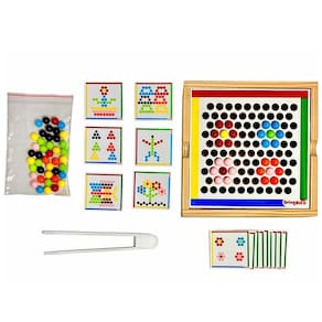 este jogo é indicado para todas as idades. Crianças menores podem se familiarizar com jogo, mas com a supervisão de um adulto, usando livremente o tabuleiro e a pinça. Embaralhe as fichas e comece a montar o tabuleiro a sequência da ficha escolhida. Auxilia no desenvolvimento da concentração, percepção de cores, coordenação motora fina e atenção. - marca: brinqmutti - dimensões: 19 x 19 x 6 cm - e lacrado - ref. : 106 - faixa etária: indicado para crianças à partir de 03 anos - contém: 70 coloridas, 01 pinça e 16 fichas em papelão. - ean: 7898703561071 - certificado pelo inmetro ce-bri/ocp - n 0069-01 nm 300/2002 segurança do brinquedo Marca: Brinqmutti
