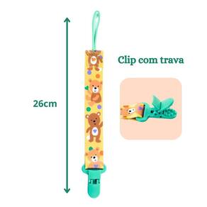 Acabamento primoroso com tecido resistente e estampas encantadoras. Compatível com a maioria dos modelos de chupetas. Fixação segura com mecanismo jacaré. Variedade de cores e estampas para combinar com o estilo do seu bebê. Benefícios do Kit: