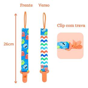 Acabamento primoroso com tecido resistente e estampas encantadoras. Compatível com a maioria dos modelos de chupetas. Fixação segura com mecanismo jacaré. Variedade de cores e estampas para combinar com o estilo do seu bebê. Benefícios do Kit: