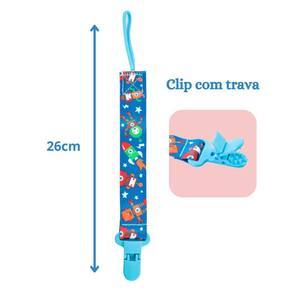 Acabamento primoroso com tecido resistente e estampas encantadoras. Compatível com a maioria dos modelos de chupetas. Fixação segura com mecanismo jacaré. Variedade de cores e estampas para combinar com o estilo do seu bebê. Benefícios do Kit: