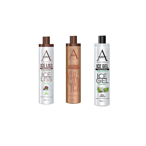 Combo 3 progressivas 1l: iceliss, vulcanica e icegel - alkimia cosmetics Ice liss: fórmula exclusiva que promove um efeito liso imediato com apenas um passo. Hidrata, regenera. O tratamento promove uma fusão de ativos restauradores responsáveis pelo controle do volume, tornando-os lisos e mais resistentes através da regeneração interna dos fios. O resultado são cabelos visivelmente regenerados, totalmente disciplinados, sedosos e com proteção antifrizz. Composição: glyoxylic, aqua, cetearyl alcohol, mineral oil, glycerin, propylene glycol, cetrimonium, chirodade, hydrolyzed karatin, hidroxyethycellulose. Cor: brancaVulcânica: fórmula exclusiva que promove um efeito liso imediato com apenas um passo. Tem efeito de longa duração e leva na fórmula ingredientes naturais como extrato de argila, óleo de carnaúba e ativos de última geração, que reduzem o volume ao mesmo tempo em que hidrata: dá brilho e rejuvenesce os fios. Composição: glutaraldeído, aqua, cetearyl alcohol, mineral oil, glycerin, propylene glycol, cetrimonium, chirodade, hydrolyzed karatin, hidroxyethycellulose. Cor: marrom Ice gel:formula exclusiva que promove um efeito liso imediato com apenas um passo. Hidrata, regenera. O tratamento promove uma fusão de ativos restauradores reponsaveis pelo controle do volume, tornando-os lisos e mais resistentes através de regeneração interna dos fios. O resultado são cabelos visivelmente regenerados, totalmente diciplinados, sedosos e com proteção antifrizz. Composição: glyoxylic, aqua, cetearyl alcohol, mineral oil, glycerin, propylene glycol, cetrimonium, chirodade, hydrolyzed karatin, hidroxyethycellulose. Cor: transparentePrecauções: mantenha fora do alcance de crianças. Conserve o produto bem fechado longe do calor e umidade. Em caso de contato com os olhos, lave imediatamente com água em abundância. Anvisa nº de autorização: 209828-6
