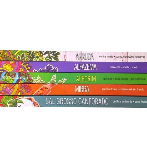 Incensos da marca: Taj Contém 1 caixa de Mirra, 1 de Alecrim, 1 de Alfazema, 1 de Arruda e 1 de Sal grosso canforado. Composição: Vareta de bambu, pós de carvão e de casca de coco, aglutinante jigat e essência Mirra: Pureza divina, contato astral e triunfo. Alecrim: Dinheiro, bons fluídos e paz espiritual. Alfazema: Relaxante e afasta o medo. Arruda: Contra inveja e vibrações negativas. Sal Grosso Canforado: Purifica ambiente e bons fluidos. os incensos transmutam e purificam as energias do ambiente, atraem boas vibrações e perfumam o ambiente. proporcionam a sensação de bem estar. Ean: 7898694972344