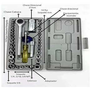 Este conjunto de chave é completo tendo 1 kit de 40 peças e Tem mais a maleta de chaves é pequena e leve você pode levar para onde você quiser E também para você guardar no carro na mochila, extremamente fácil de ser . Conjunto de chave canhão foi desenvolvido para auxiliar você Em suas atividades com ferramentas ele é portátil, super pratico para organizar E você pode leva-lo em situações de Emergência, seu conjunto vai estra lá te ajudando. Tamanho aproximado da caixa: a:12.5xl:24cm Peso aproximado: 1030g 1 - chave catraca 17cm 1 - adaptador 3/8x21mm 1 - adaptador x3/8 5.4cm 1 - chave suporte para bits 3/8 14.1cm 1 - disco de catraca 3/8 1 - prolongador 3/8 6.7cm 14 - soquete 4 / 4.5 / 5 / 5.5 / 6 / 6.5 / 7 / 7.5 / 8 / 9 / 10 / 11 / 12 / 13mm 14 - soquete 5/32, 3/16, 7/32, , 9/32, 5/16, 11/32, 3/8, 13/32, 7/16, 15/32, , 17/32 e 9/16 3 - soquete oitavados , 5/16 e 3/8 2 - soquete 3/8 15 e 16 Cor: cromado Composição: plastico e metal Marca: Não Informado