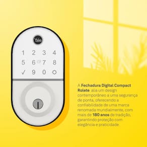 Combo Fechadura Digital Compact Branca Rolete - Yale Está incluso: Fechadura Digital Compact Branca Rolete e Hub A Fechadura Digital Compact da Yale é uma opção moderna e segura para quem busca praticidade e tecnologia. Obs: Somente a lado externo da fechadura (painel com display) pode ficar exposto ao tempo. - Espessura de Porta: 35 a 70mm - Até 250 Senhas - Até 250 Biometrias - Até 250 Tags - Guia de Voz 3 idiomas: Inglês, Espanhol e Português - 4 Pilhas AA alcalinas autonomia de até 3.600 acionamentos - Resistente a intempéries. Somente a lado externo da fechadura (painel com display) pode ficar exposto ao tempo. - Garantia do fabricante: 24 meses - Tipos de abertura: Senha numérica, biometria, cartão, chave de segurança ou App Yale Connect