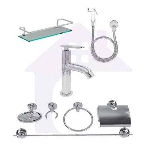 01 porta toalha de banho 47 cm 01 porta toalha de rosto 01 saboneteira 01 papeleira 01 cabide duplo 01 porta shampoo reto vidro 01 ducha higienica branco 01 torneira abs cod 120