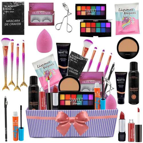 Descrição do Kit: 1 - Paleta de Sombras: Ideal para qualquer tipo de ocasião a paleta de sombras deixará seu olhar ainda mais lindo, composta com cores incríveis capazes de deixar as expressões faciais ainda mais harmoniosas.1 - Base Mate: Mantenha sua pele sempre com o acabamento uniforme e aveludado, indicada para quem quer corrigir pequenas imperfeições uniformizando a pele. 1 - Máscara de Cílios: Item Fundamental para sua maquiagem, ela alonga da volume e curva aos cílios, levantando a expressão do olhar. 1 - Esponja Tipo Gota: Espalhe de forma uniforme a base cobrindo todos os poros da pele. 1 - Par de Cílios Postiços: Eleve seu olhar a outro nível, composta por cerdas macias e uniformes, é a combinação perfeita para um lindo delineado. 1 - Batom Bastão: O Famoso Batom nunca sai de moda, totalmente prático para seu dia-a-dia, além de cuidar da saúde dos lábios enquanto realça a região com sua cor.1 - Batom Líquido: A Textura Líquida tende a ter uma durabilidade Maior, o Batom sendo líquido Preenche o contorno dos lábios com uma precisão muito maior. 1 - Lápis de Olho Preto: com o lápis de olho poderá garantir ótimos efeitos em seu olhar, poderá delinear e esfumar. 1 - Curvex: Deixar seus cílios curvadinhos nunca ficou tão fácil, com o curvex poderá deixa-los sempre uniformes, dará a impressão de ter cílios mais longos, mantendo sempre curvadinhos. 1 - Sache máscara de cravos: Com a Máscara de Cravos é possível remover os cravos da pele, além de hidratar e renovar a pele, eliminando as células mortas. 1 - Sache Lagrimas Mágicas: Pode ser Utilizado como primer ou como hidratante, feita de óleos vegetais, controla a oleosidade e aumenta a regeneração do tecido.1 - Pó Compacto: O Pó Compacto é composto de micropartículas de minerais. Geralmente é utilizado após a Sequência da Base. Garante melhor fixação da maquiagem e evita o brilho excessivo da pele; 1 - Fixador: Tem a brilhante função de fazer com que a maquiagem dure mais, deixa a pele com aspecto natural, auxilia no fechamento dos poros e suaviza as marcas de expressão; 1 - Kit com 4 Pincéis: Para atingir a Make perfeita, poderá utilizar o kit de pincéis que irão auxiliar no que for preciso para proporcionar o efeito desejado. 1 - Caixa de presente com tampa: Para ficar ainda mais completo esse lindo kit, acompanha uma linda caixa para presente com tampa, onde poderá assim presentear quem mais ama. Imagens Ilustrativas, Marcas, estampas e cores dos produtos são variadas e poderão mudar conforme reposição.