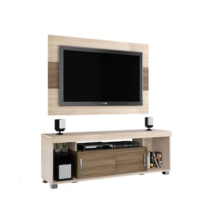 O Combo Pierre combina rack e painel em MDP 15 mm com pintura UV, oferecendo um visual moderno e ótima capacidade para sua sala. Acabamento na cor Areia/Amêndoa, portas deslizantes com puxadores cromados e pés cromados em poliestireno.