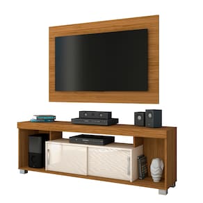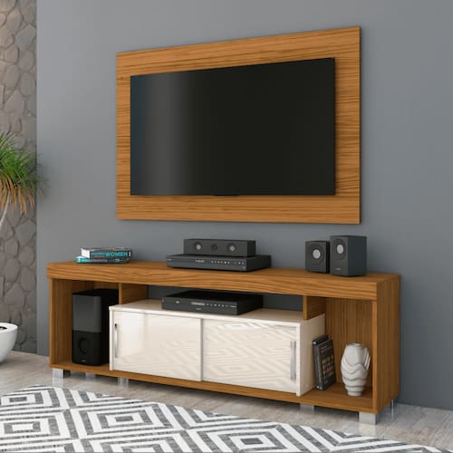 O Combo Pierre combina rack e painel em MDP 15 mm com pintura UV, oferecendo um visual moderno e ótima capacidade para sua sala. Acabamento na cor Naturale/Off White, portas deslizantes com puxadores cromados e pés cromados em poliestireno.