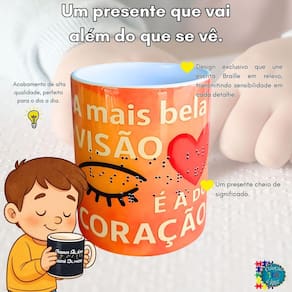 Principais atributos: - Conjunto com 3 canecas exclusivas para acessibilidade - Impressão em alta qualidade com Braille em relevo para leitura tátil - Design moderno com frases motivacionais para inspirar o dia a dia - Material resistente, fácil de limpar e seguro para uso diário - Dimensões ideais 325 ml para café, chá ou sucos, garantindo conforto ao segurar